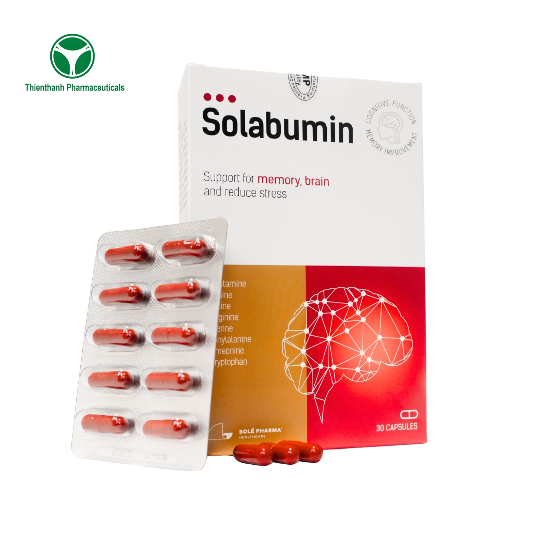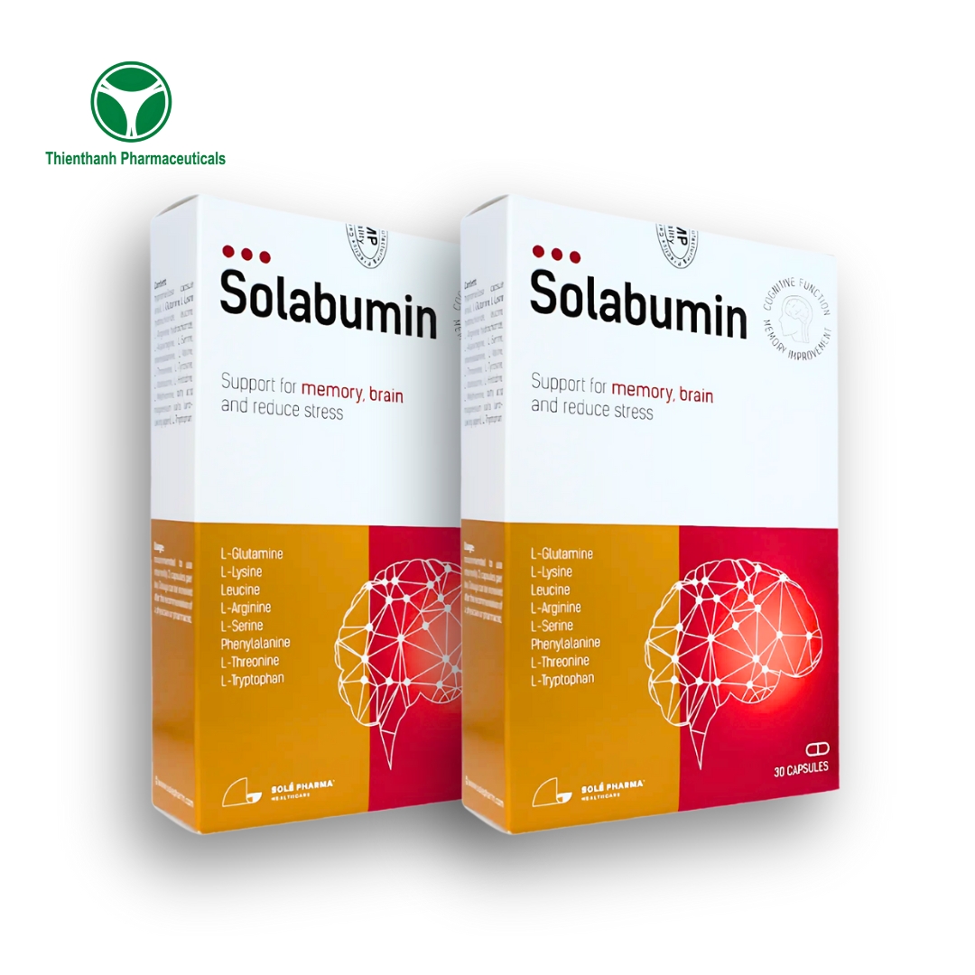 Solabumin là viên uống bổ sung phức hợp 14 acid amin quan trọng như L-Glutamin, Lysin, Leucin, Arginin, Phenylalanin, Threonin, Tryptophan… giúp phục hồi thể lực, tăng cường trí nhớ, cải thiện sức khỏe toàn diện và hỗ trợ hoạt động của não bộ. Sản phẩm được nhập khẩu từ Latvia, đạt tiêu chuẩn chất lượng châu Âu và đã được cấp số ĐKSP tại Việt Nam.